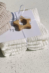 Our set of 2 Birdies Snow White SMALL is made from buttery soft muslin fabric and makes a wonderful addition to baby's essentials. It fits perfectly in every diaper bag and is therefore always ready to hand. It is also very suitable as a scarf or headscarf, head pad, for washing, (breast)feeding and many more.